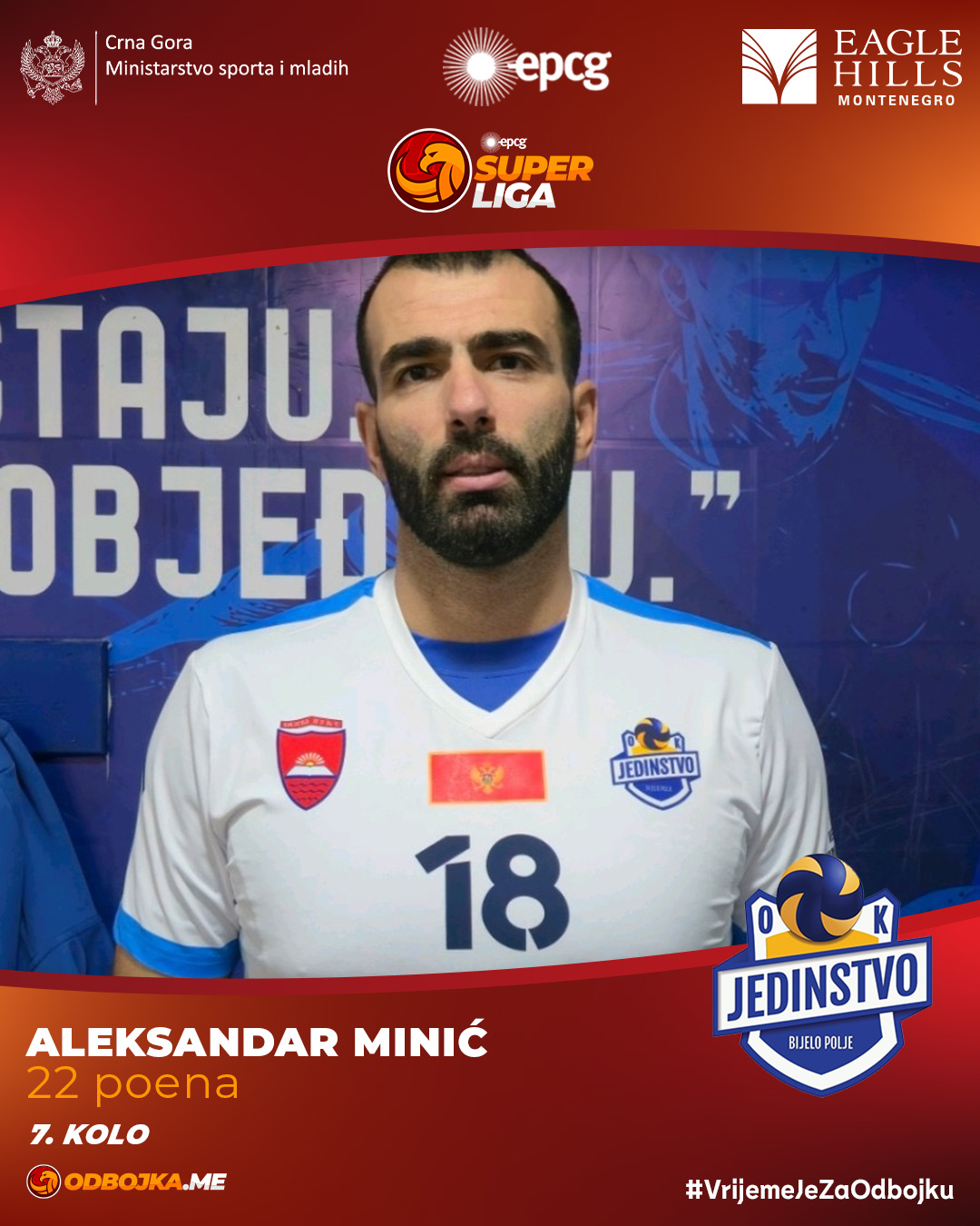 Najbolji poenter sedmog kola EPCG Superlige je Aleksandar Minić iz Jedinstva. U ubjedljivoj pobjedi svog tima protiv Mornara u Bijelom Polju (3:0), Minić je briljirao sa 22 osvojena poena i bio najefikasniji igrač susreta.