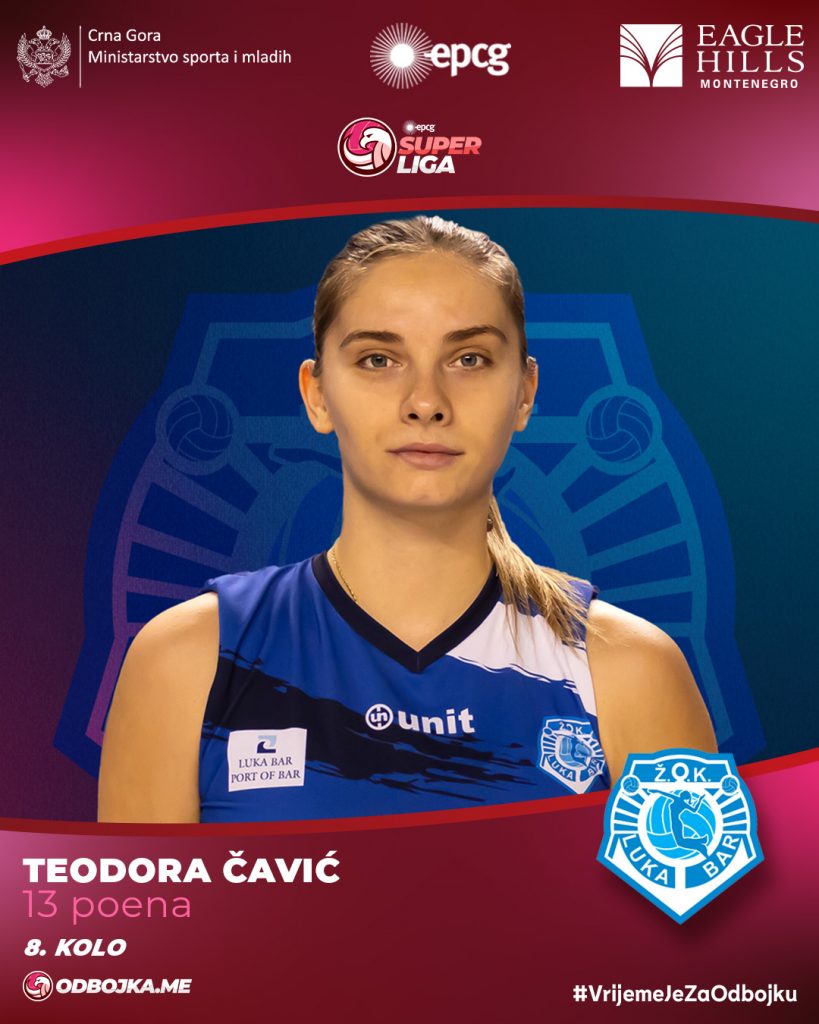 Među najefikasnijim igračicama kola našla se i Teodora Čavić iz Luke Bar. U ubjedljivoj pobjedi “Sirena” protiv Budve (0:3), Čavićeva je zabilježila 13 poena i bila ključna poenterka gošći.