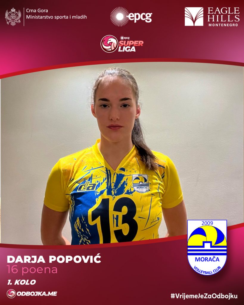 Povratak u crnogorsku odbojku Darja Popović obilježila je izuzetnom partijom. Talentovana reprezentativka takođe je meč završila sa 16 poena, zahvaljujući čemu je Morača savladala Jedinstvo 3:0 (25:11, 25:19, 25:18).