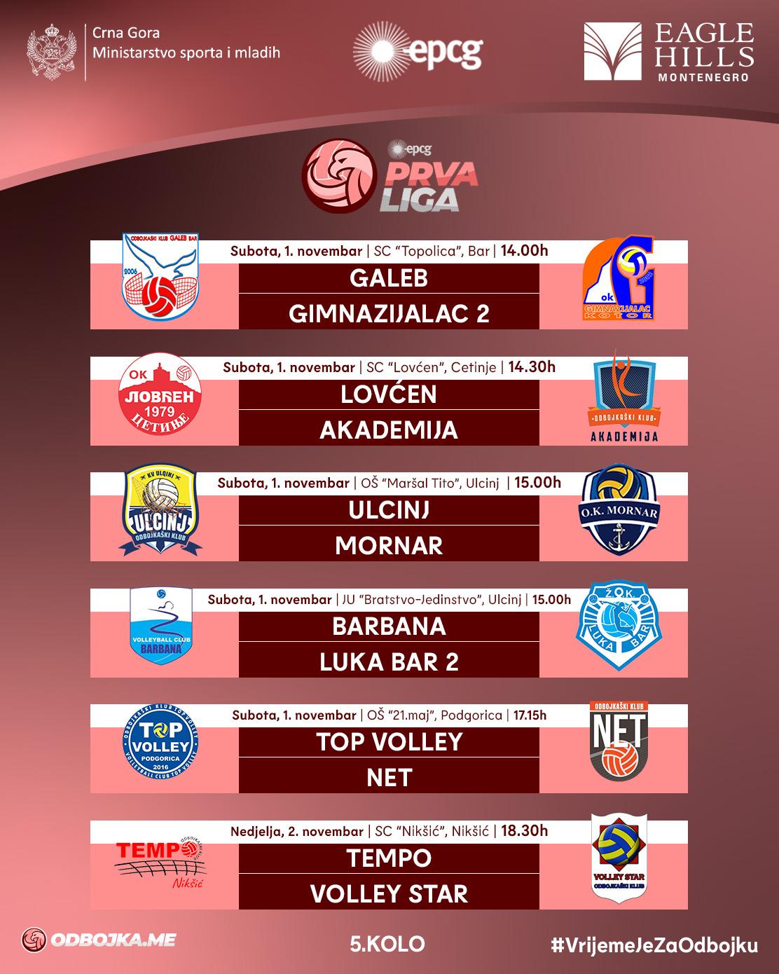 Kolo će u grupi B otvoriti gradski duel između Top Volleyja i Neta, koji se igra u subotu od 17.15 časova u sali OŠ “21. maj” u Podgorici. Net je jedini tim bez poraza u grupi, dok Top Volley još uvijek čeka na prvu pobjedu.