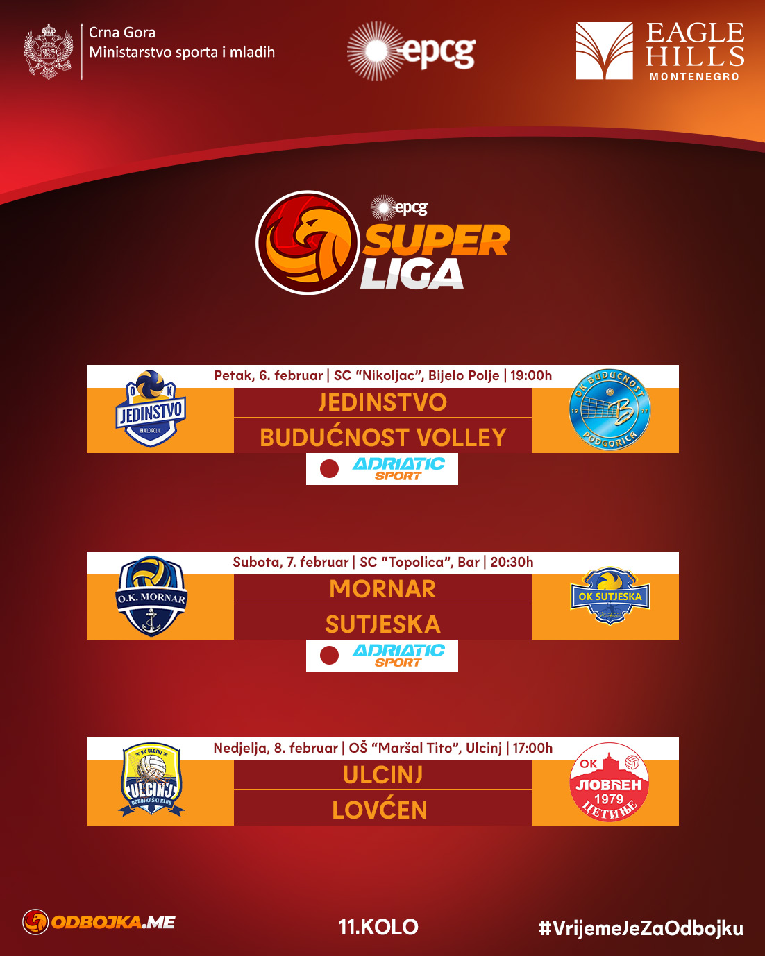 Utakmice 11. kola EPCG Superlige odbojkaša igraju se u naredna tri dana u Bijelom Polju, Baru i Ulcinju. Lider, ekipa Budve, slobodna je ovog vikenda.