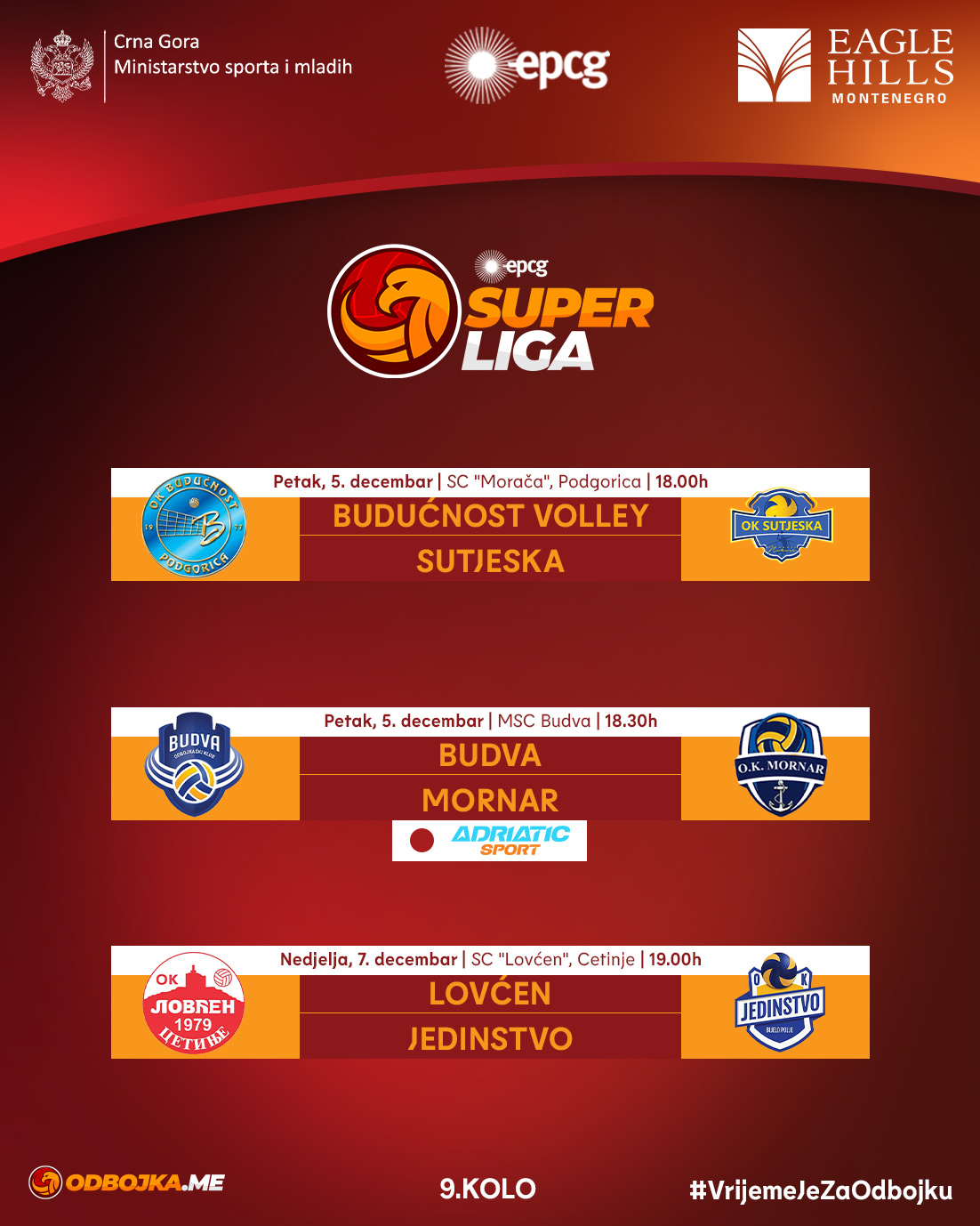 Utakmicama 9. kola biće nastavljena EPCG Superliga odbojkaša. Vodeće ekipe biće domaćini u petak, dok će posljednjeplasirani Lovćen ugostiti Jedinstvo, koje traži proboj ka vrhu.