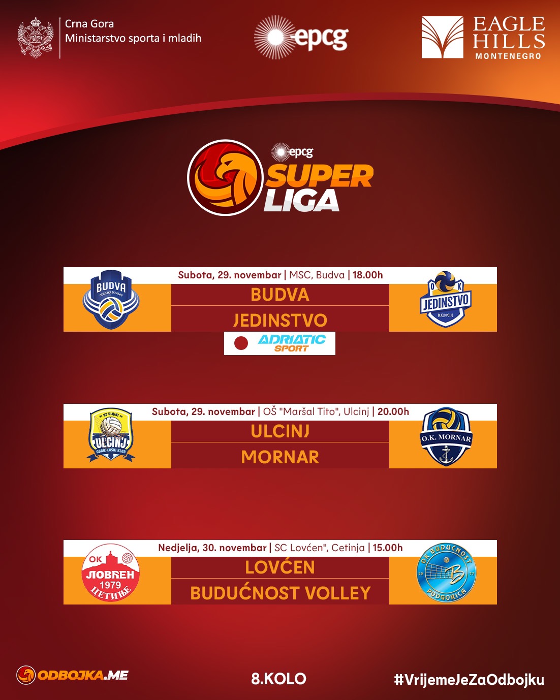 Nakon spektakularnog derbija u Budvi, narednog vikenda odigraće se utakmice 7. kola EPCG Superlige odbojkaša, kojim će početi druga polovina borbe za mjesto u plej-ofu. Budva nakon velike pobjede dočekuje Jedinstvo, Budućnost će gostovati na Cetinju, a Ulcinj u komšijskom derbiju dočekati Mornar.