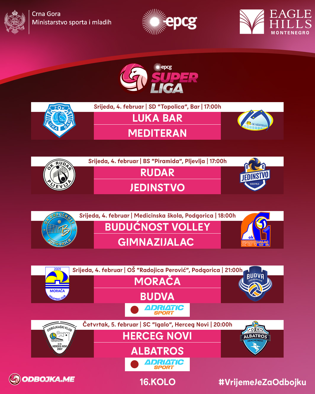 Utakmice 16. kola EPCG Superlige odbojkašica igraju se 4. i 5. februara u četiri grada. Rundu će zaključiti duel hercegnovskih ekipa, Luka Bar i Budućnost biće domaćini Mediteranu i Gimnazijalcu, a u Pljevljima derbi začelja.