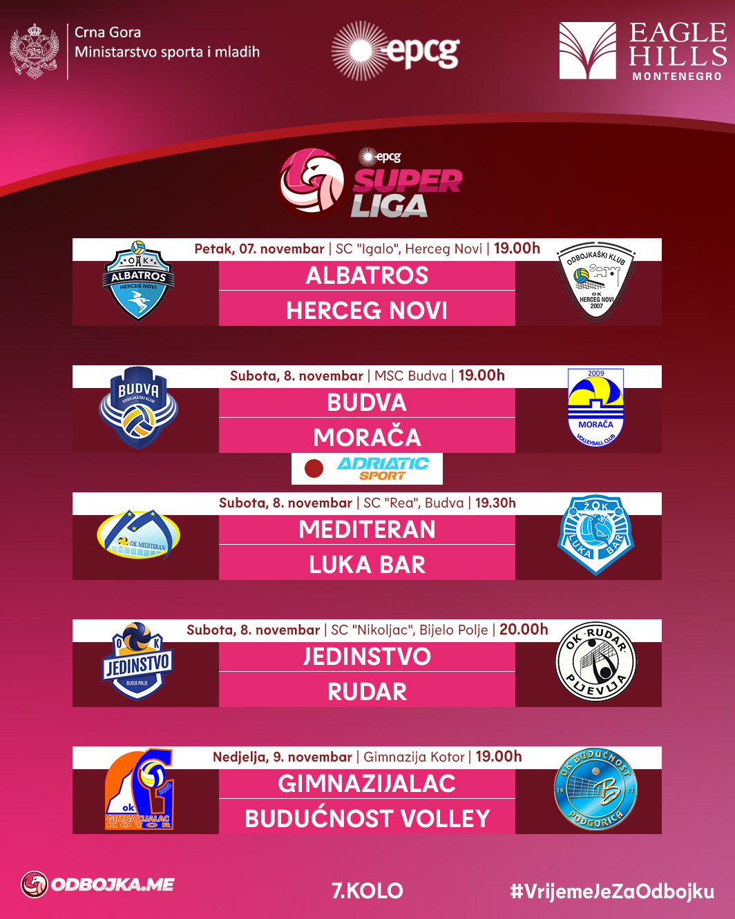Utakmicom u Herceg Novom počeće sedma runda EPCG Superlige odbojkašica, a duel u Kotoru će je zaključiti. Naredna tri dana donose novski derbi, ujedno i derbi kola, kao i dva meča u Budvi i susret timova sa sjevera Crne Gore.