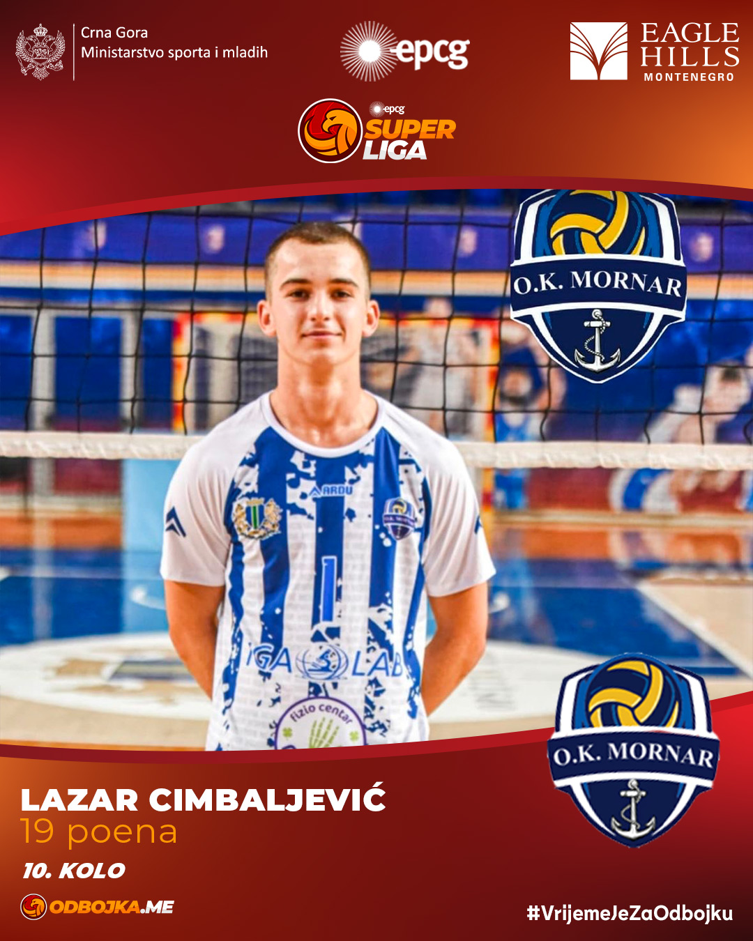 Odbojkaši Mornara sigurnom pobjedom nastavili su takmičenje u EPCG Superligi. Savladali su Lovćen 3:0 na Cetinju, a najbolji na parketu bio je mladi primač servisa barskog sastava, Lazar Cimbaljević, koji je imao 19 poena i bio najuspješniji igrač 10. kola.