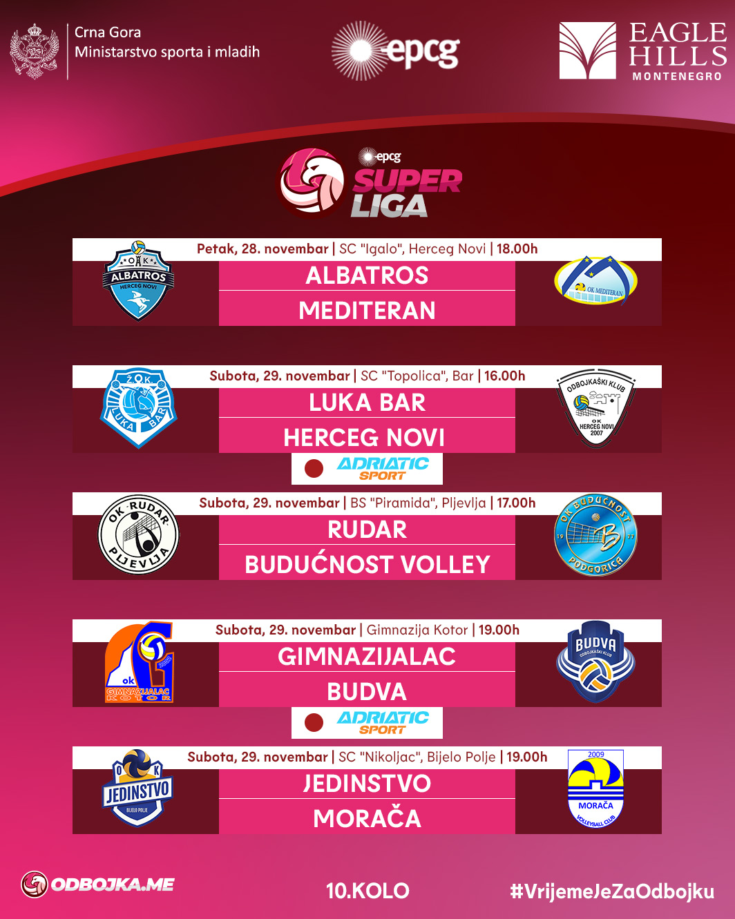 Ostale četiri utakmice igraju se u subotu, a najzvučniji duel otvoriće program. Luka Bar će, nakon dva poraza u SC „Igalo“ – u Superligi i četvrtfinalu Kupa – ugostiti ekipu Herceg Novog u SC „Topolica“, u kojoj je poražena u Superkupu na početku sezone. Svaki od tri dosadašnja meča velikih rivala donio je neizvjesnost i makar četiri seta, tako da duel koji se igra od 16 sati, uz prenos na Adriatic Sport TV, garantuje uzbuđenje. Herceg Novi je jedini tim sa svim pobjedama u prvoj polovini prvenstva i jedini koji je pobijedio Luku Bar ove sezone.