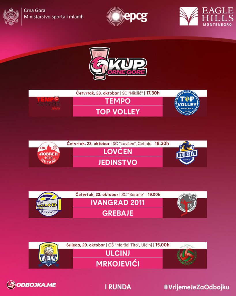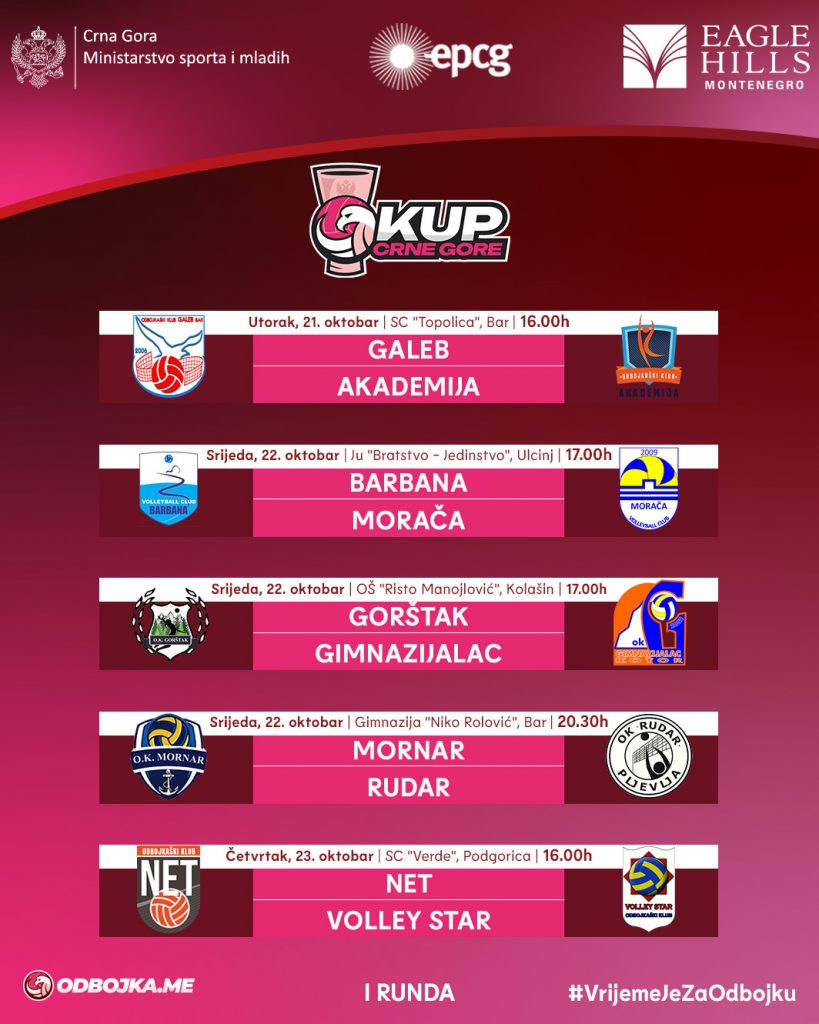 U četvrtak će Kup otvoriti duel poznatih rivala iz grupe “B” EPCG Prve lige – Neta i Volley Stara. Meč se igra od 16 časova u SC “Verde” u Podgorici. Ekipa Neta je do sada neporažena u ligi, dok je nikšićki tim zabilježio jednu pobjedu. U narednoj rundi, pobjednik će igrati protiv boljeg iz susreta Lovćen – Jedinstvo.