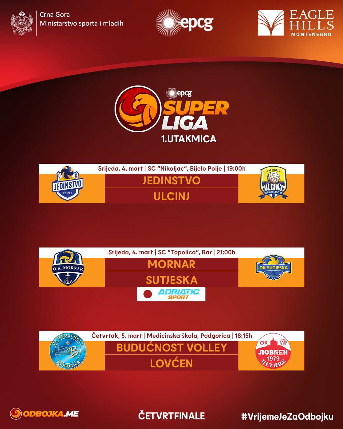 Istog dana, sa početkom u 21 sat u SC „Topolica“, igra se derbi runde. Mornar će u Baru dočekati Sutjesku u duelu timova koji su do posljednjeg kola vodili borbu za četvrto mjesto i prednost domaćeg parketa u međusobnoj seriji. U ligaškom dijelu Sutjeska je slavila u Baru 3:1, dok je Mornar uzvratio u Nikšiću pobjedom 3:2. Prenos utakmice je na Adriatic Sport TV.