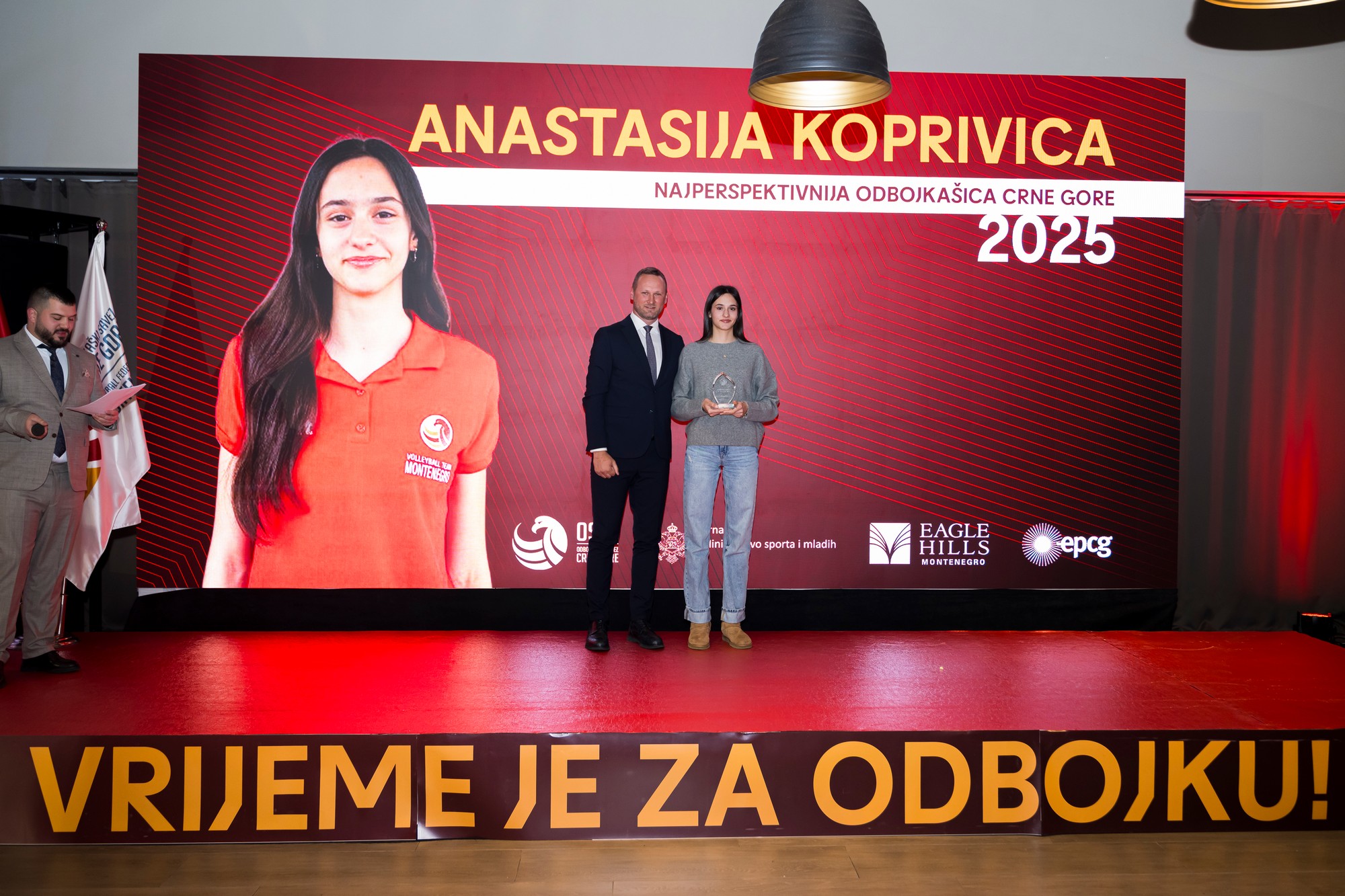 Najbolja odbojkašica i odbojkaš Crne Gore u godini su Saška Đurović i Vojin Ćaćić, koji zbog klupskih obaveza nisu prisustvovali ceremoniji, a nagrade će im biti uručene prvom prilikom tokom 2026. godine. Iz Portugala, odnosno Njemačke, obratili su se video-porukama.