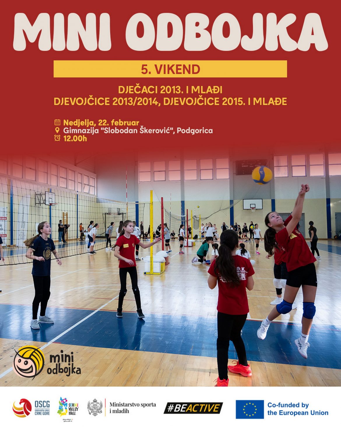 Peti vikend devete sezone “Mini odbojke” u konkurenciji dječaka 2013. godišta i mlađih, djevojčica rođenih 2013/2014. godine, kao i djevojčica 2015. godišta i mlađih odigran je u nedjelju, 22. februara u sali Gimnazije “Slobodan Škerović” u Podgorici.