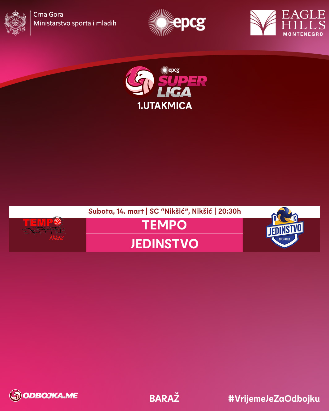 Utakmicom u Nikšiću u subotu, 14. marta, počeće baraž za posljednje mjesto u narednoj sezoni EPCG Superlige odbojkašica. Tempo će dočekati ekipu Jedinstva u SC „Nikšić“ od 20:30 časova u prvoj utakmici dvomeča.