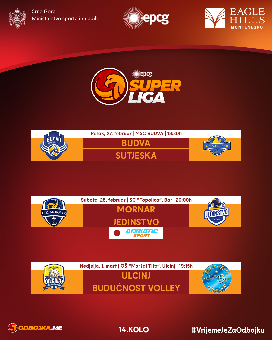 Utakmice posljednjeg, 14. kola ligaškog dijela šampionata Crne Gore za odbojkaše na programu su u naredna tri dana, a jedino neriješeno pitanje pred plej-of je četvrta pozicija na tabeli. Nju, ujedno i prednost domaćeg parketa u međusobnim susretima u nokaut fazi, jure odbojkaši Sutjeske i Mornara.